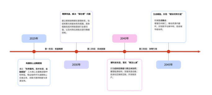 物业减碳绝非“一阵风”,《报告》更给出了清晰的“时间表”和“路线图”,将中国物业碳中和转型分为三阶段推进: